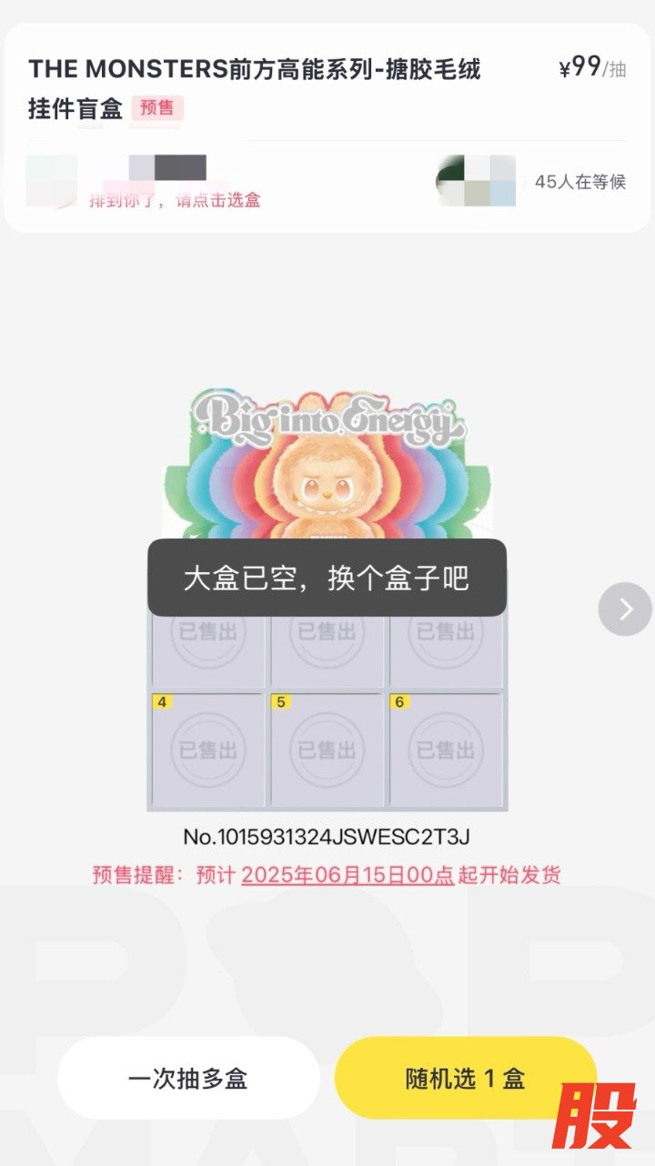 记者在4月25日当天通过泡泡玛特官方小程序进入排队抢购通道,系统页面显示现在在售的3.0系列新品已经是6月15日发货的预售,并且还不一定能够排到。在此情况下,更多消费者涌向了现货充足的二手交易网站。