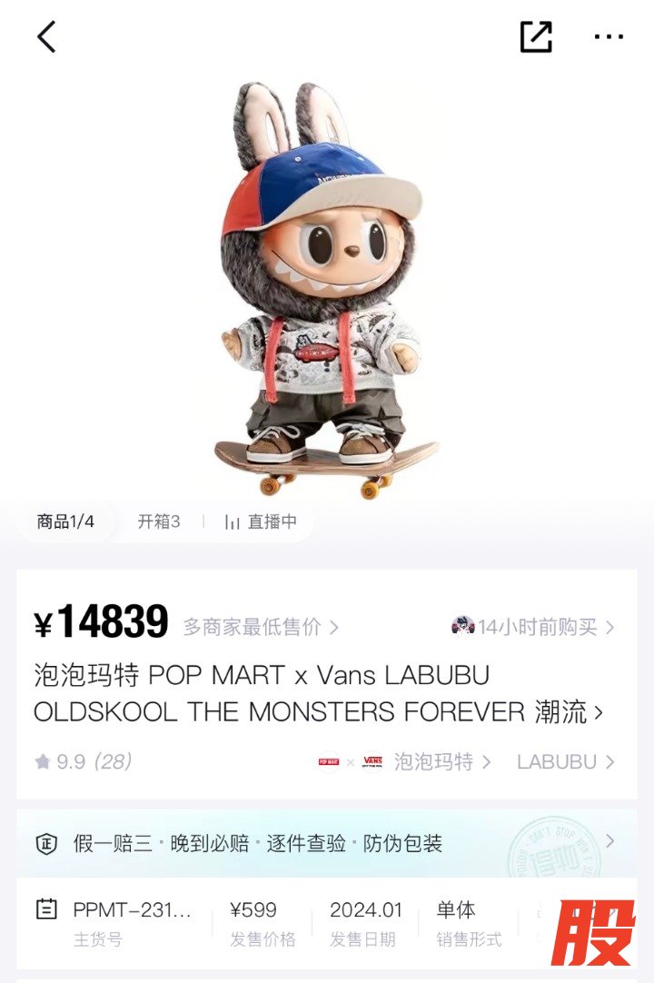 受欢迎的不止最新款,LABUBU此前发布的一些热门系列,在二手市场上价格翻一倍很正常,翻三倍也不少见,尤其是一些抽中概率较小的“隐藏款”和品牌联名款。以去年发售的LABUBU与Vans联名款为例,发售价为599元的潮玩在二手市场上已经涨价到14839元。